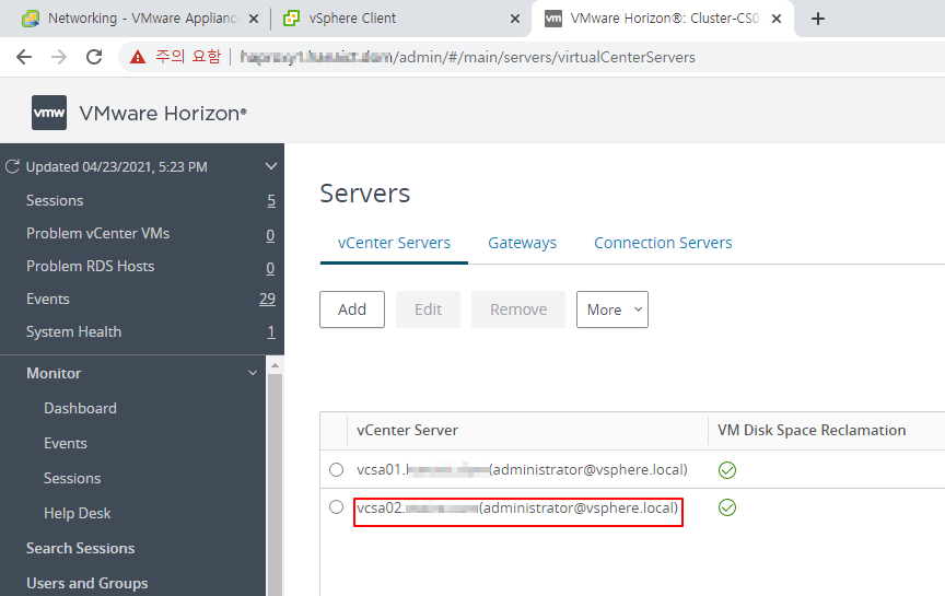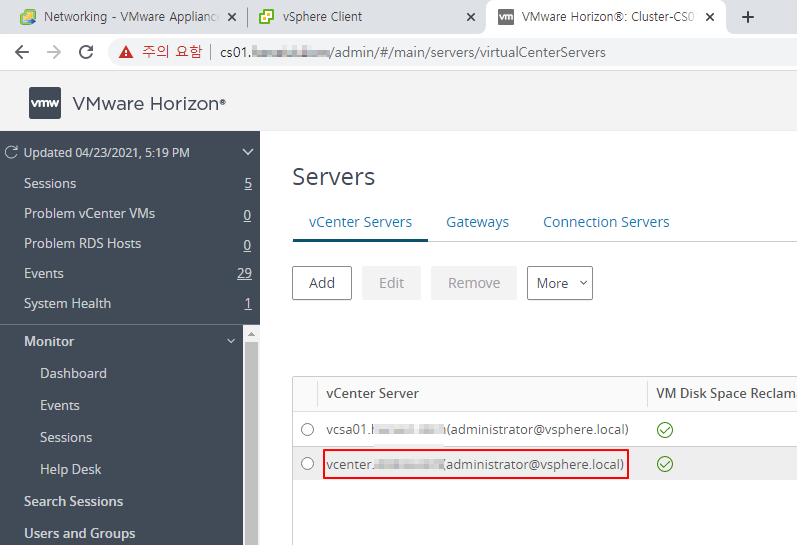 5. 인벤토리의 데스크톱풀에서의 vCenter서버 정보 변경 확인