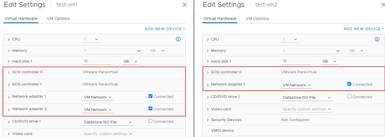 test-vm1 VM : SCSI 2개, Network adapter 2개 구성
