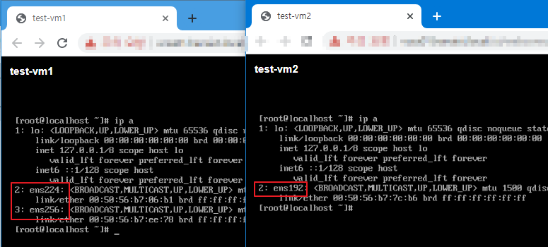 test-vm1의 첫번째 nic는 ens224이고 test-vm2의 첫번째 nic는 ens192 입니다.