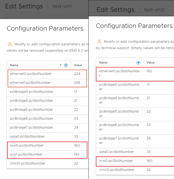 2개의 VM에서 PCI SLOT 번호를 확인해보는데 서로 다르게 나오고있습니다.