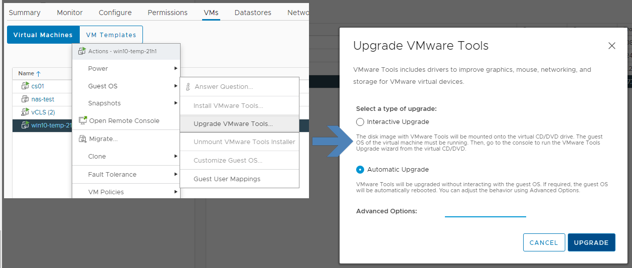 [주의] 업글레이드를 선택하면 tools를 업그레이드 하고 VM이 재부팅됩니다. 주의해서 수행하세요
